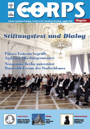 7 Corpsstudentische Termine Aus den Verbänden 6 Wir Corpsstudenten sind eine Einheit (VAC-Vorstand) 8 Immer ein gutes Netzwerk (WVAC-Vorstand) 10 WSC-Vorort Aachen (Vorstellung der Vorortmannschaft) 11 WSC-Vorortübergabekommers (Feier im Aachener Krönungssaal) 12 Kösener Congress (Ein neues KSCV-Corps in Belgien) 14 Weinheimtagung (Vorstandswahl und Wachenburgmedaillen) 16 KSCV-Vorort Freiburg im Breisgau (Vorstellung der Vorortmannschaft) 18 Friedrich-von-Klinggräff-Medaille (Die Preisträger 2017) 21 CorpsConnect (Die neue Vernetzung) Titel 22 Stiftungsfest und Dialog (Stadt und Universität auf der Gästeliste, Spende für das Humboldt-Forum Berlin) Corps Aktuell 26 Seminar zur Tiroler Geschichte (Rhaetia gedachte der Landesverteidiger) 27 Rerum cognoscere causas (Über die humanistische Bildung) 30 Kneipe für einen guten Zweck (Spende an Hungerhilfe der UN) 31 (Un)Zeitgemäße Betrachtungen („Wohl dem, der seiner Väter gern gedenkt …“) 32 Bundesverdienstkreuz (Hohe Auszeichnung für Corpsstudenten) 33 Firmenjubiläum auf dem Corpshaus (Dr. Küke GmbH mit internationalen Gästen) Treffpunkt AHSC 34 AHSC Wuppertal (145 Jahre) Rubriken 36 Aus der Corpsbibliothek 39 Impressum