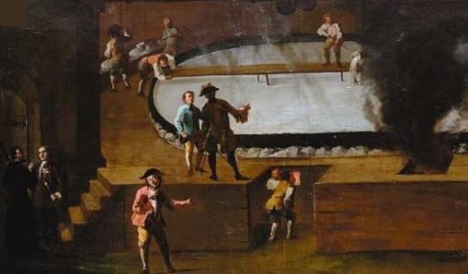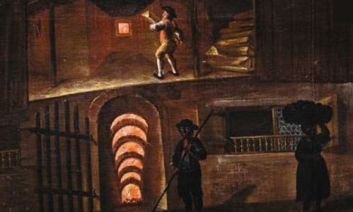 Unter der Sudpfanne: Kohle und Asche fallen durch den aus fünf Mauerbögen bestehenden Feuerrost in den darunterliegenden „Luftgraben“. Die „Widtzieherin“ (rechts Im Bild) muss die Asche und Kohle aus dem Luftgraben ablöschen und entsorgen.