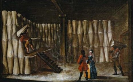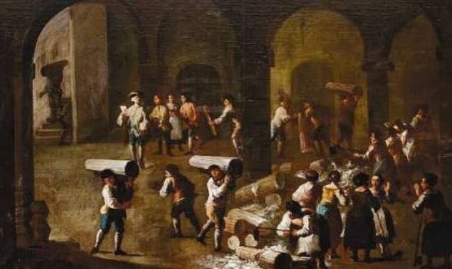 Die fertig getrockneten „Fuder“ werden in die Lagerräume getragen. Fuder sind getrocknete Salzstöcke, die entstehen, wenn das noch feuchte Salz In einer Saline in eine „Perkufe“, ein Salzfass, gestampft wurde.