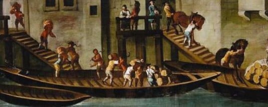 Der „Salzausgang“ beginnt: Die „Weittrager“ tragen die Salzfässer von den Stoßstätten zu den Transportschiffen und übergeben sie hier den „Schiffährtlern“, die für die fachgerechte Verstauung der Fässer verantwortlich sind.