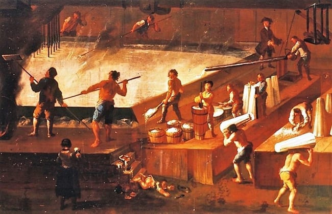Als „Salzwurf“ wird das Zerschlagen der „Fuder“ zu kleinen Salzbrocken bezeichnet. Es waren Frauen, die traditionell für diese Arbeit eingesetzt wurden. Links oben im Bild: Ein bayerischer „Salzgegenschreiber“ überwacht den Versand des für Bayern bestimmten Salzes.