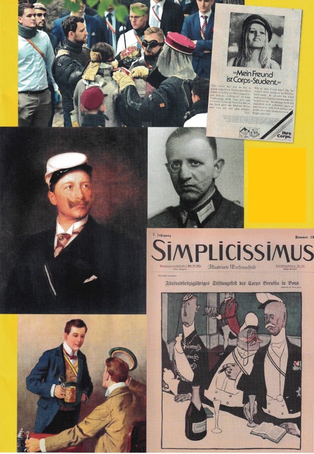 Über 200 Jahre Corps: selbstbewusst anders sein. Oben: Pauktag auf der Rudelsburg und eine in die Jahre gekommene Corps-Kampagne. Links: Wilhelm von Preußen Borussiae Bonn und Fritz-Dietlof von der Schulenburg. Untern: Couleurpostkarte von Georg Mühlberg und eine launische Karikatur aus dem Simplicissimus.