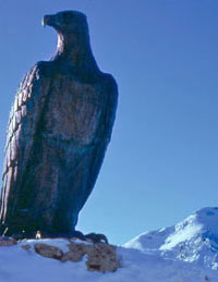 Ein über zweieinhalb Meter hoher Bronzeadler erinnert heute oberhalb des Karerpasses an Theodor Christomannos (Der Druckstock ist eine Leihgabe der „Dolomiten", Tageblatt der Südtiroler in Bozen.)